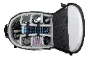 Fits DSLR/mirrorless cameras with customizable compartments for lenses and gear.